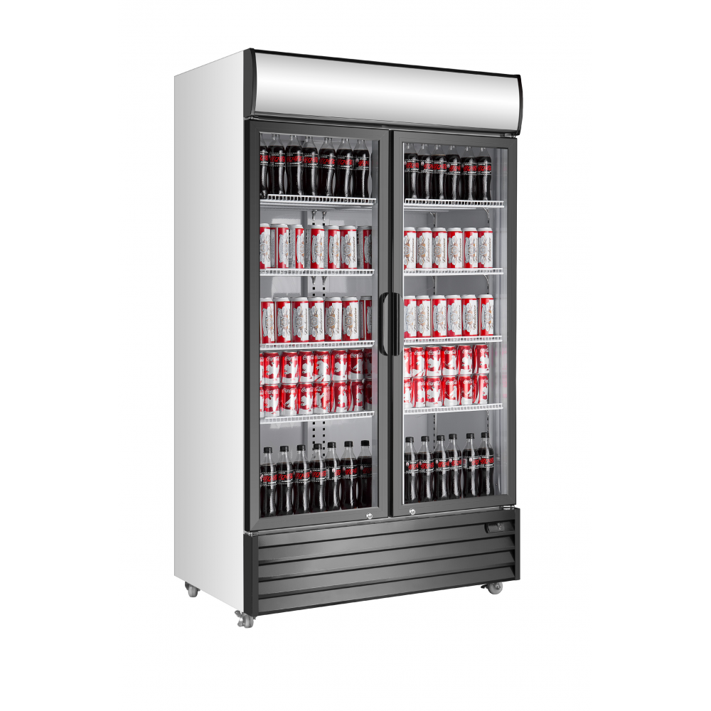 Armario expositor refrigeración de bebidas EXPO 1130 TN puertas de cristal abatible, refrigeración ventilada, iluminación vertical, estantes regulables, con control digital, cerraduras y ruedas con freno. Ideal para bares, tiendas, supermercados, restaurantes, cafeterías, hoteles, catering, etc.