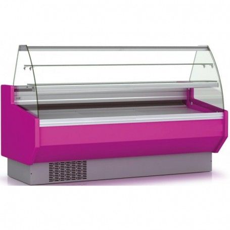 Vitrina expositora refrigerada ideal para pastelerías que quieren atraer al cliente mostrando sus productos conservando al mismo tiempo su calidad, con cristal frontal curvo con un fondo de 9400 mm y largo de 2 metros, fabricada en España, decorado en varios colores.