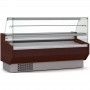 Vitrina expositora refrigerada ideal para pastelerías que quieren atraer al cliente mostrando sus productos conservando al mismo tiempo su calidad, con cristal frontal recto con un fondo de 9400 mm y largo de 1,5 metros, fabricada en España, decorado en varios colores.
